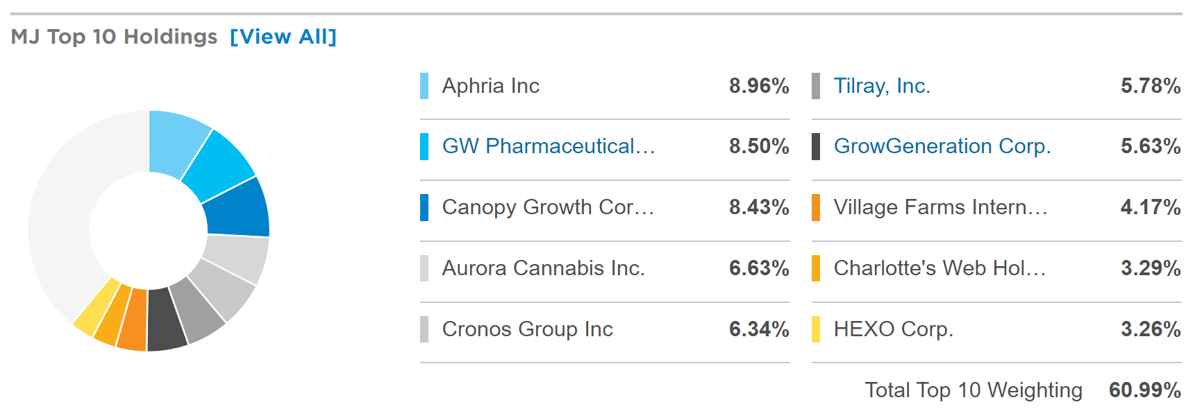 전 세계에 마리화나 TOP 10이 무엇인지 알 수 있습니다. TOP 10기업의 구성이 MJ ETF 안에서 약 60.99%를 차지하고 있습니다.